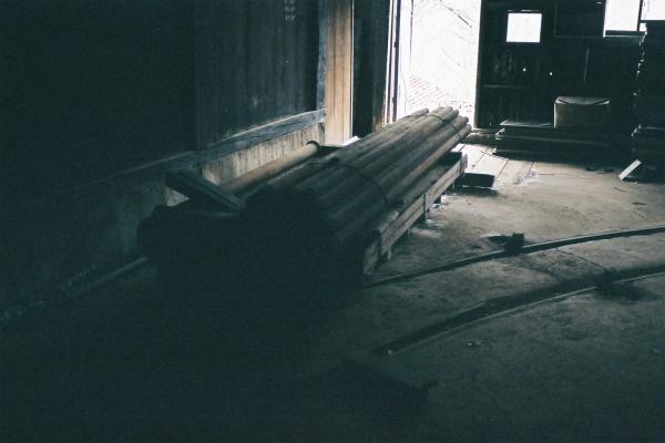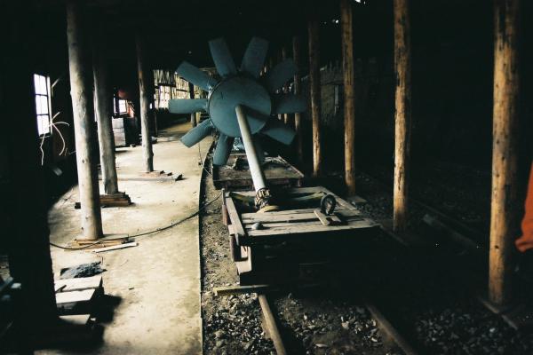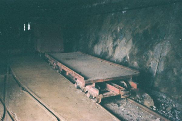 良く見えないが,奥の天井が崩れ車輌に落ちている.車輌には「火薬」とある.