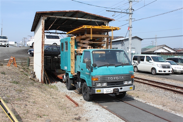 保線用の牽引車.通常の自動車を改造,ゴムタイヤで走行するようだ.