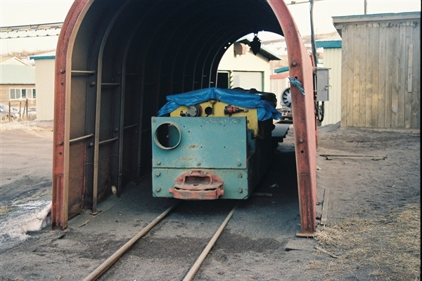 未舗装の道を歩いて行くと採掘した土だか炭だか判らないがそういう物が山になっている作業場が現れた.頭上にはベルトコンベアが縦横に設置されている.事務所や作業場の建物の向こうに炭車のような物が見えたので入って行くと,広大な敷地に軌道が何本も敷かれている.架線は既にないが,架線柱や信号等の施設もそのまま.しかし使われなくなって久しいのか辺りは草むしている.軌間は610ミリと聞いているが,レールは太く立派である.